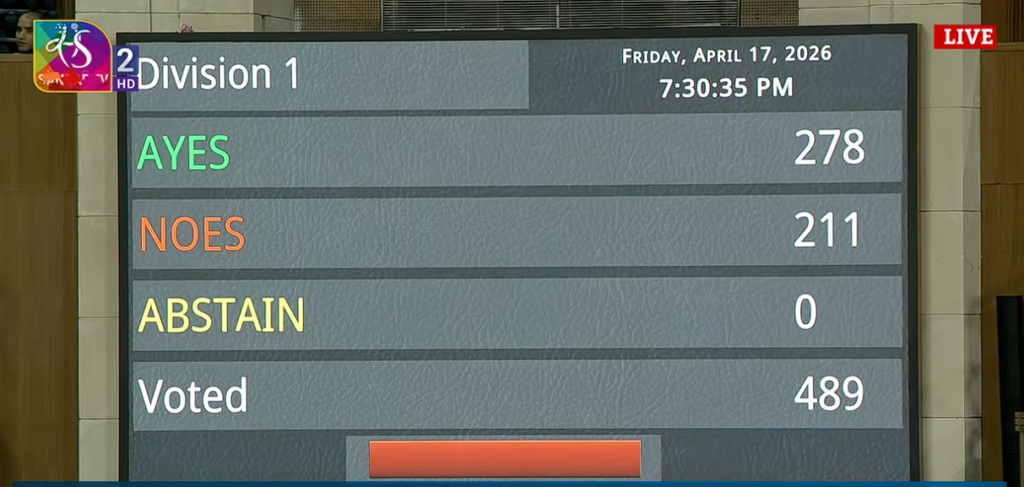 सदन के पटल पर दो तिहाई आंकड़ा न छूने पर लोकसभा में गिर गया महिला शक्ति वंदन अधिनियम. आपको बता दें कि कुल 528 वोट पड़े हैं जिनमें पक्ष में 298 और विपक्ष में 230 वोट पड़े. यह आंकड़ा पहले 211 था बाद में बढ़कर 230 पहुंच गया. सरकार ने तीनों विधेयक वापस लिए.